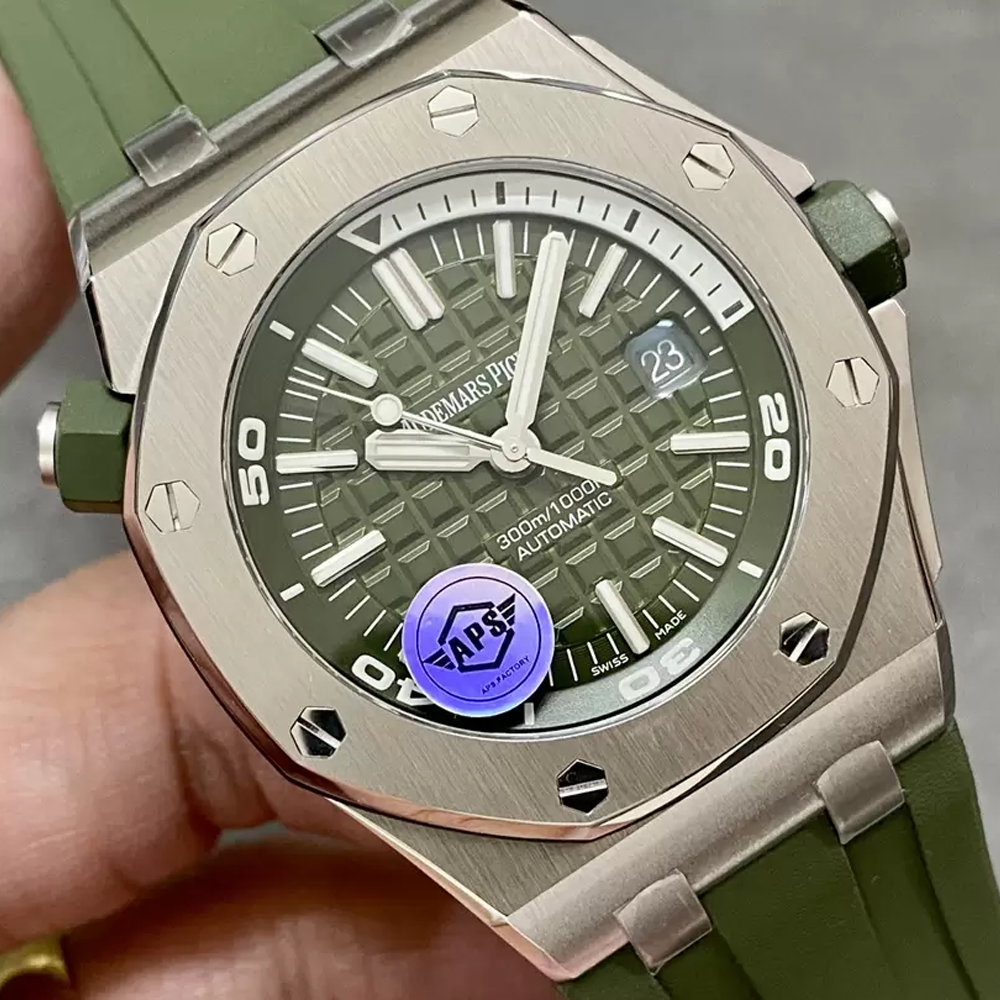 오데마피게 로얄오크 오프쇼어 다이버 그린 텍스처 다이얼 SS 그린 러버 스트랩 42mm 15710