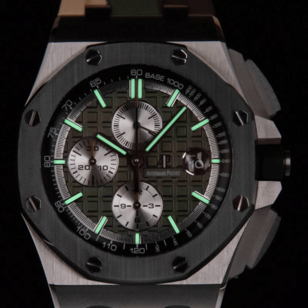 오데마피게 로얄오크 오프쇼어 크로노그래프 그린 다이얼 세라믹 SS 그린 러버스트랩 44mm 26400SO