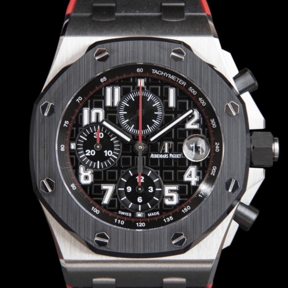 오데마피게 로얄오크 오프쇼어 크로노그래프 블랙 다이얼 스틸 블랙/레드 러버스트랩 44mm 26470SO