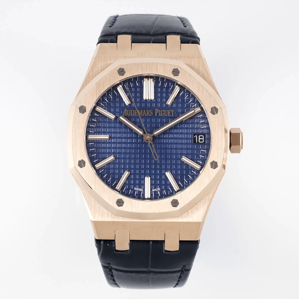 오데마피게 로얄오크 50주년 한정판 블루 텍스처 다이얼 로즈골드 블랙 가죽스트랩 41mm 15510OR