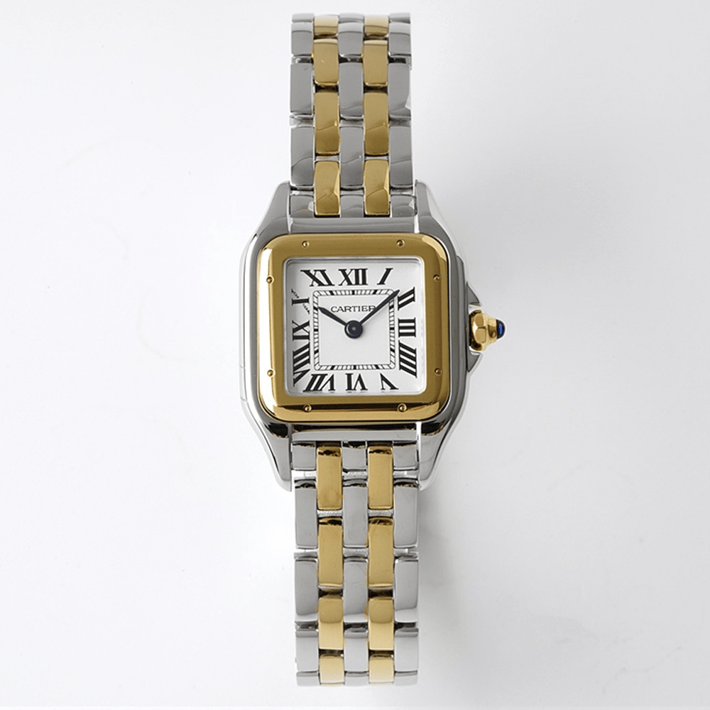 Cartier Panthère de Cartier Cheetah 시계는 더욱 입체적이고 넉넉해 보이는 사각형 이중 레이어 케이스를 사용하여 시계의 우아함과 고전주의를 강조합니다.흰색 다이얼에 Cartier 스타일의 시간 눈금 디자인은 시계에 브랜드 매력을 불어넣습니다.파란색 중앙의 시침과 분침은 시간과 함께 춤추는 두 마리의 엘프처럼 전체 시계에 광채를 더합니다.