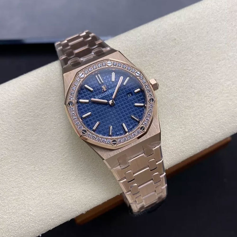 ZF 팩토리 여성용 AP 오데마 피게 로얄 오크 시리즈 67651 로즈 골드 다이아몬드 베젤 블루 다이얼 시계