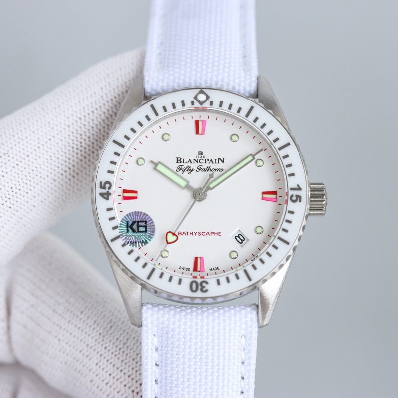 기존 Fifty Fathoms Bathyscarf와 한눈에 차별화되는 요소는 흰색 다이얼에서 찾을 수 있습니다. 3, 6, 9, 12시 방향의 아플리케 인덱스 양면은 연분홍색으로 도금되었으며, 분 트랙도 분홍색으로 인쇄되었습니다. 사랑의 상징인 '하트'를 구현하여 한눈에 발렌타인데이 한정판임을 알 수 있습니다. 물론, 각 인덱스와 핸즈의 중앙은 슈퍼루미노바 코팅 처리되어 어두운 곳이나 다이빙 환경에서도 충분한 가독성을 보장합니다.