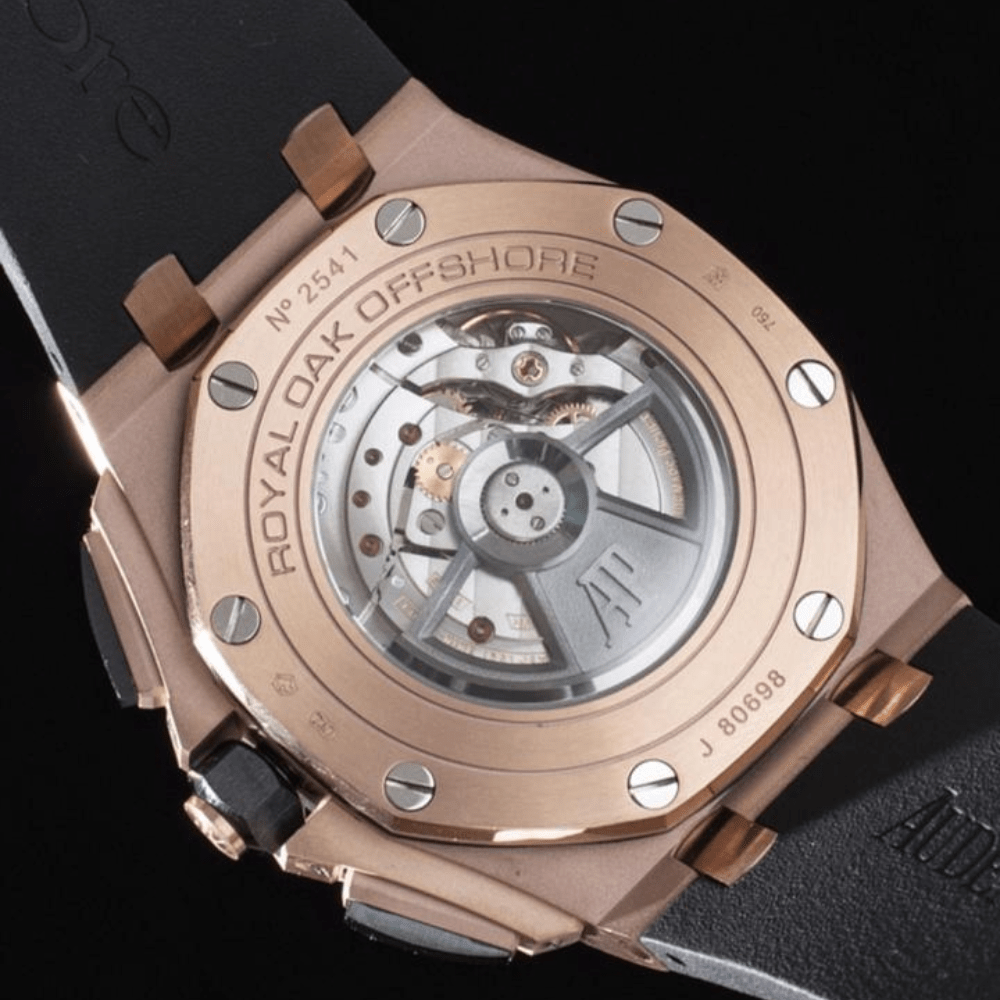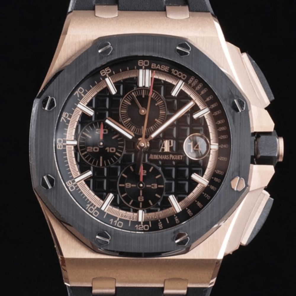 오데마피게 로얄오크 오프쇼어 크로노그래프 블랙 다이얼 로즈골드 블랙 러버스트랩 44mm 26401RO