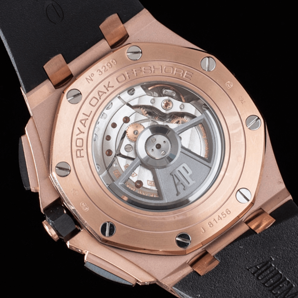 오데마피게 로얄오크 오프쇼어 크로노그래프 블랙/화이트 다이얼 로즈골드 블랙 러버스트랩 44mm 26401RO
