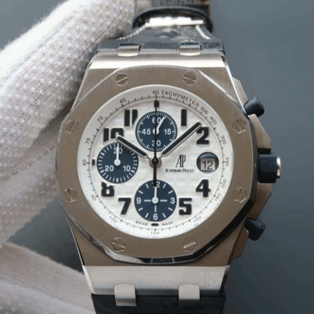 오데마피게 로얄오크 오프쇼어 화이트/블루 다이얼 스틸 가죽 스트랩 42mm 26470ST