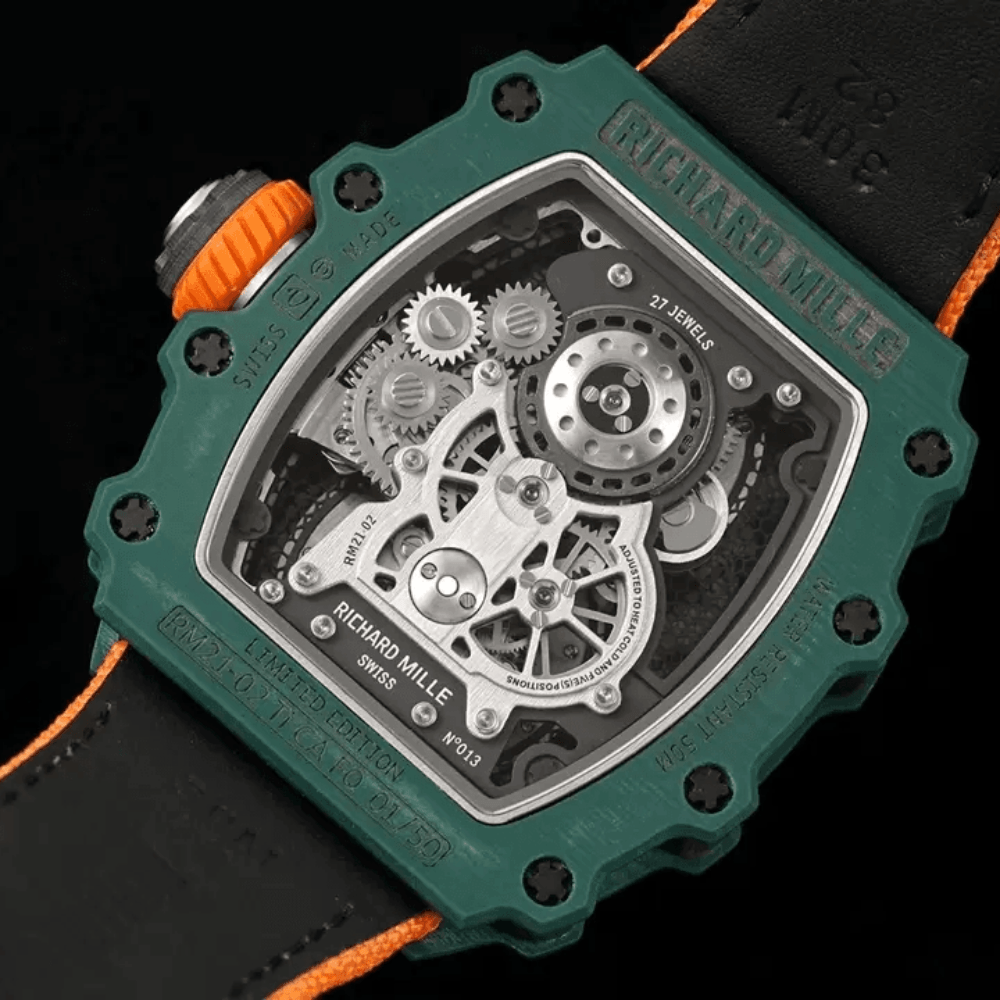 이 시계는 리차드 밀 케이스 중 가장 복잡한 작품 중 하나입니다. 베젤과 케이스 양쪽의 베젤 하단 커버는 그린 쿼츠 TPT 쿼츠 섬유로 제작되었습니다. 티타늄 합금 소재로 제작되어 다층적인 미래 감각을 보여줍니다.