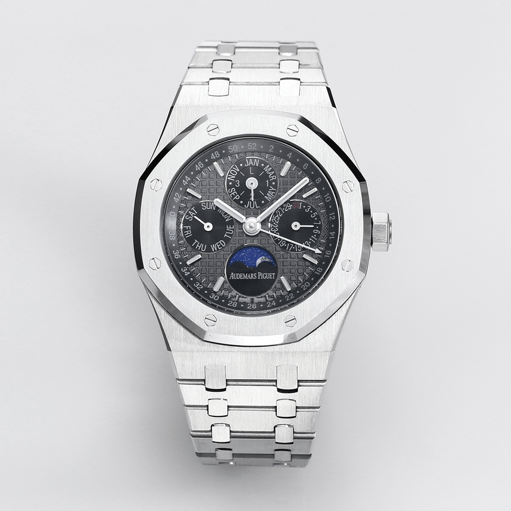 BBR 오데마 피게 로얄 오크 시리즈, 복잡한 기능을 갖춘 퍼페추얼 캘린더 시계. 모델: 26574ST.OO.1220ST.03 업계 유일의 독창적인 기능을 구현했습니다.