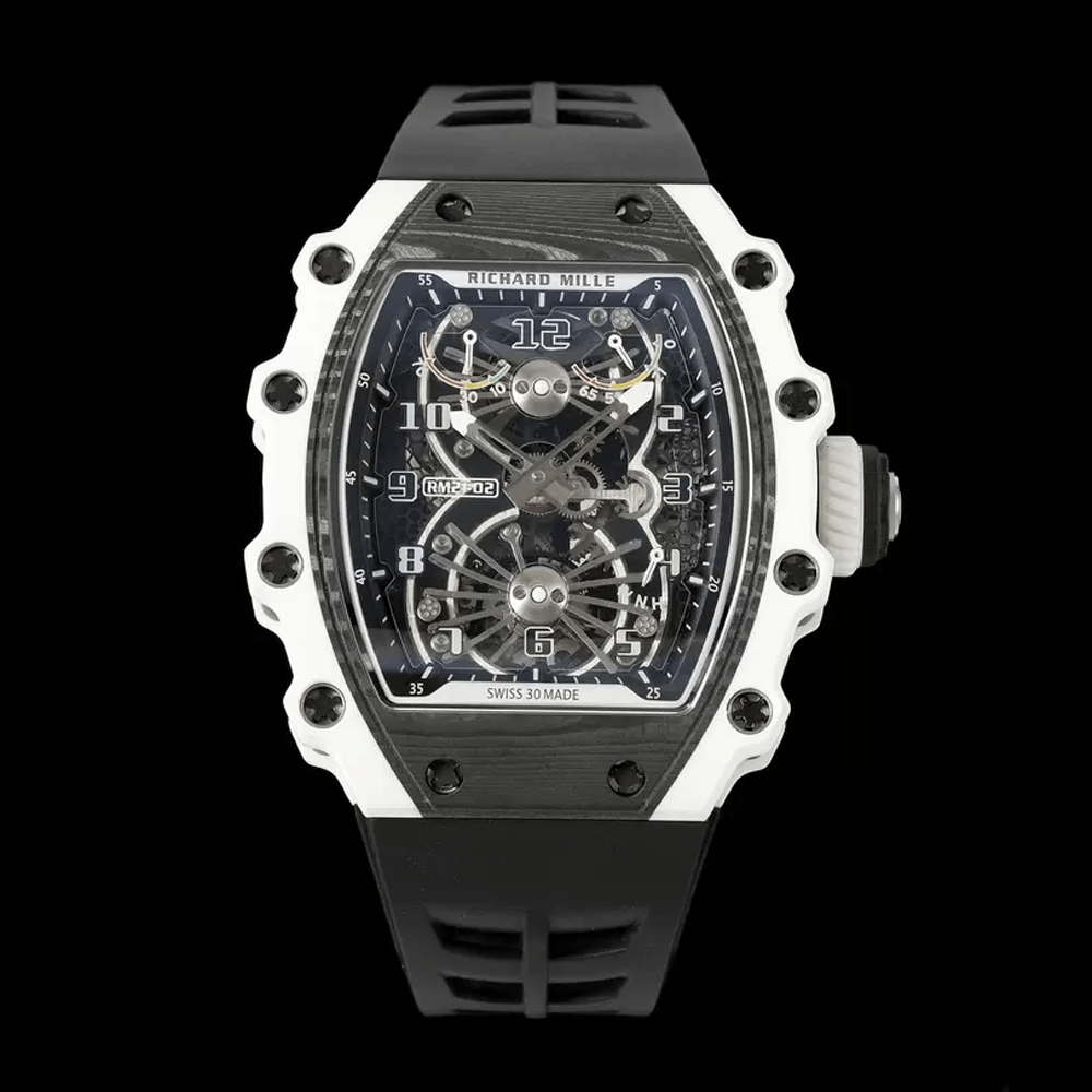 RM 21-02 스켈레톤 투르비용 워치의 특별한 특징은 케이스에 사용된 "블랙"과 "화이트" 팬더 색상의 대비되는 조합입니다. 새로운 케이스 구조는 특히 복잡합니다. 미들 케이스 프레임은 티타늄으로, 프런트 케이스와 사이드 필러는 카본 TPT 카본 파이버로, 베젤과 백 케이스는 쿼츠 TPT 쿼츠 파이버로 제작되었습니다. 순백색 쿼츠 파이버와 신비로운 블랙 카본 파이버는 뚜렷한 층을 이루며 강렬한 시각적 효과를 선사합니다.