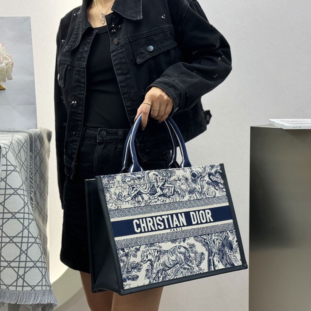 디올 북 토트 스트랩 백 미듐 뜨왈 드 주이 소바쥬 화이트 네이비 블루