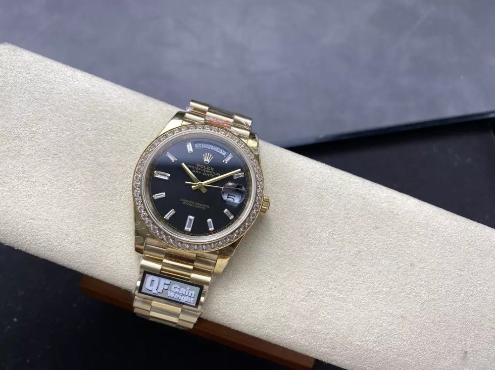 최신 Day-Date 40 레퍼런스 프레지던트228398 40mm 옐로우 골드 케이스, 다이아몬드 베젤, 블랙 다이얼, 다이아몬드 마커, 프레지던트 브레이슬릿으로 잘 제작되고 섬세하며 가장 정확하게 재현되었습니다.