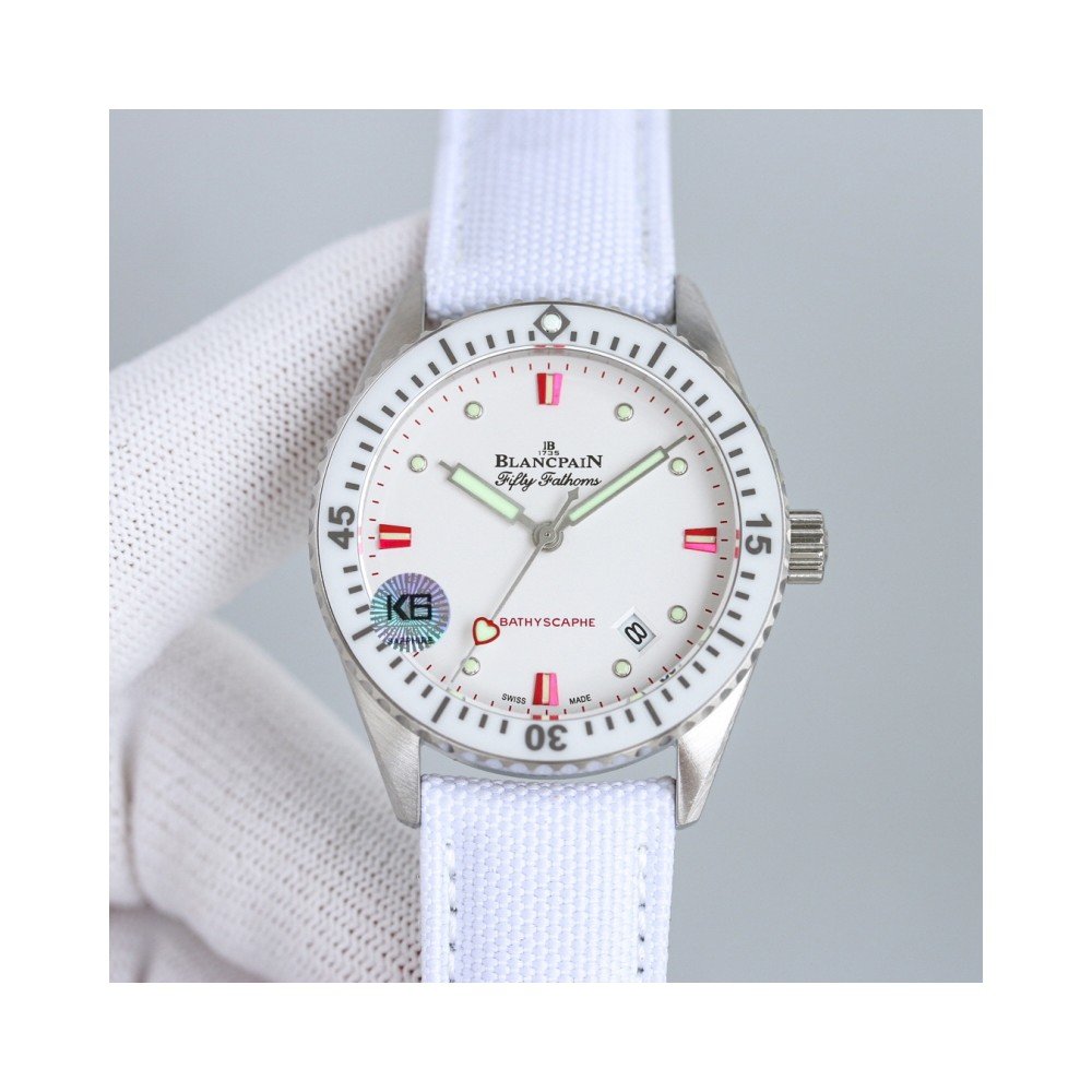 기존 Fifty Fathoms Bathyscarf와 한눈에 차별화되는 요소는 흰색 다이얼에서 찾을 수 있습니다. 3, 6, 9, 12시 방향의 아플리케 인덱스 양면은 연분홍색으로 도금되었으며, 분 트랙도 분홍색으로 인쇄되었습니다. 사랑의 상징인 '하트'를 구현하여 한눈에 발렌타인데이 한정판임을 알 수 있습니다. 물론, 각 인덱스와 핸즈의 중앙은 슈퍼루미노바 코팅 처리되어 어두운 곳이나 다이빙 환경에서도 충분한 가독성을 보장합니다.